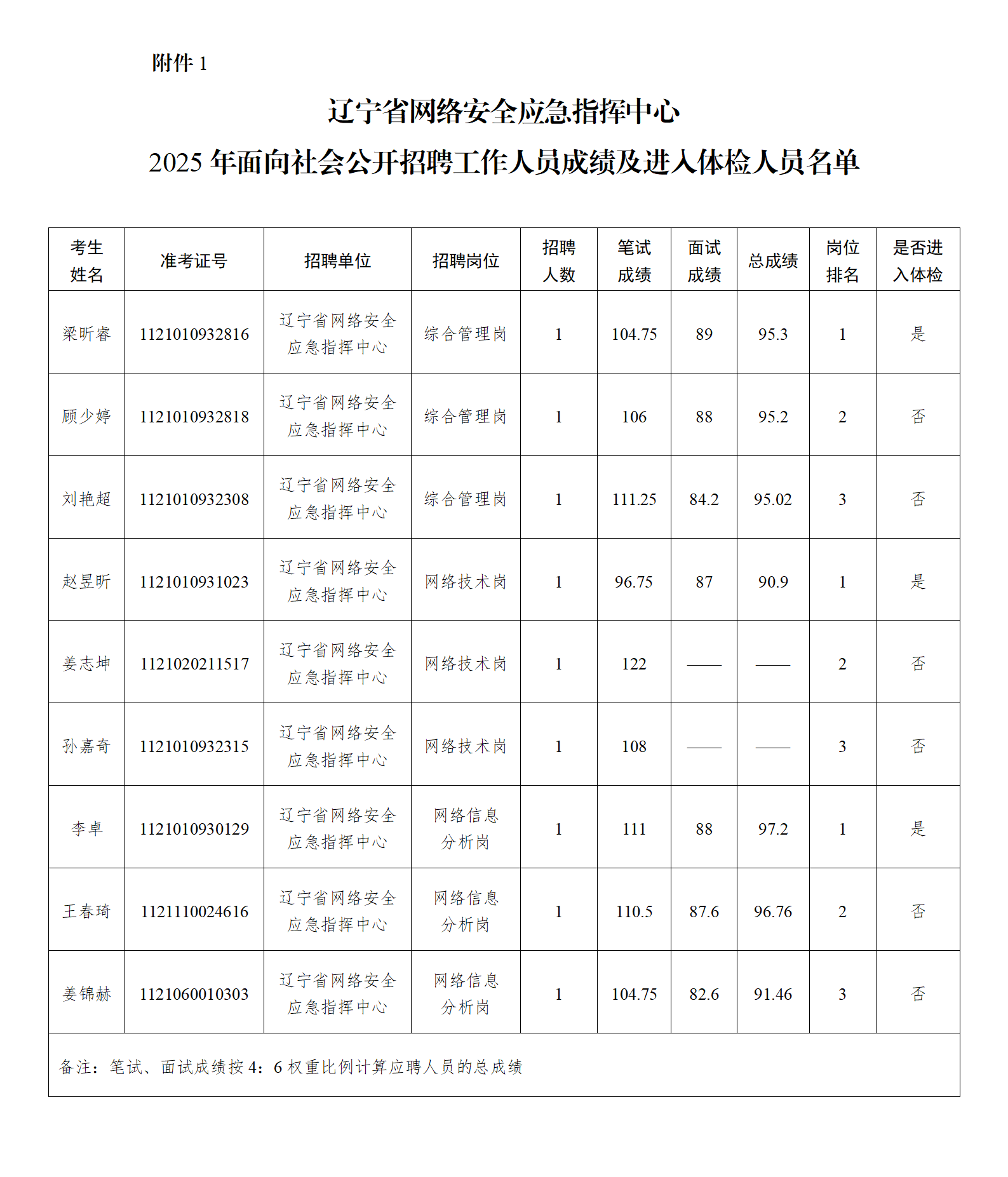 附件:辽宁省网络安全应急指挥中心2025年面向社会公开招聘工作人员成绩及进入体检人员名单